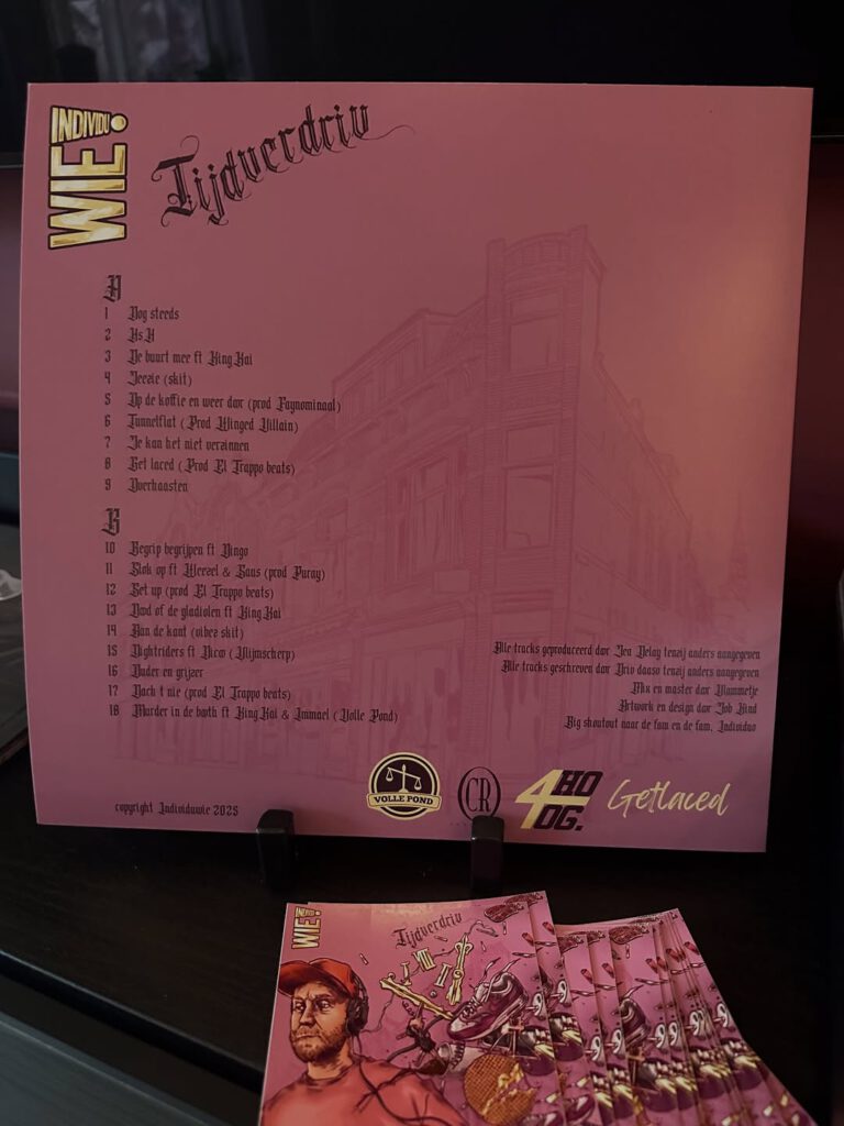 Het duurt nog even voordat het album “Tijdverdriv” van Individuwie op de online streamingdiensten verschijnt. Echter kun je het album wel al op vinyl verkrijgen. De van uit oorsprong afkomstige Gouwenaar heeft op het door Job Kind ontworpen artwork de kenmerkende Goudse stroopwafel staan, de geliefde sneakers en uiteraard zichzelf. Op het album staan een aantal bijdragen van bevriende artiesten.