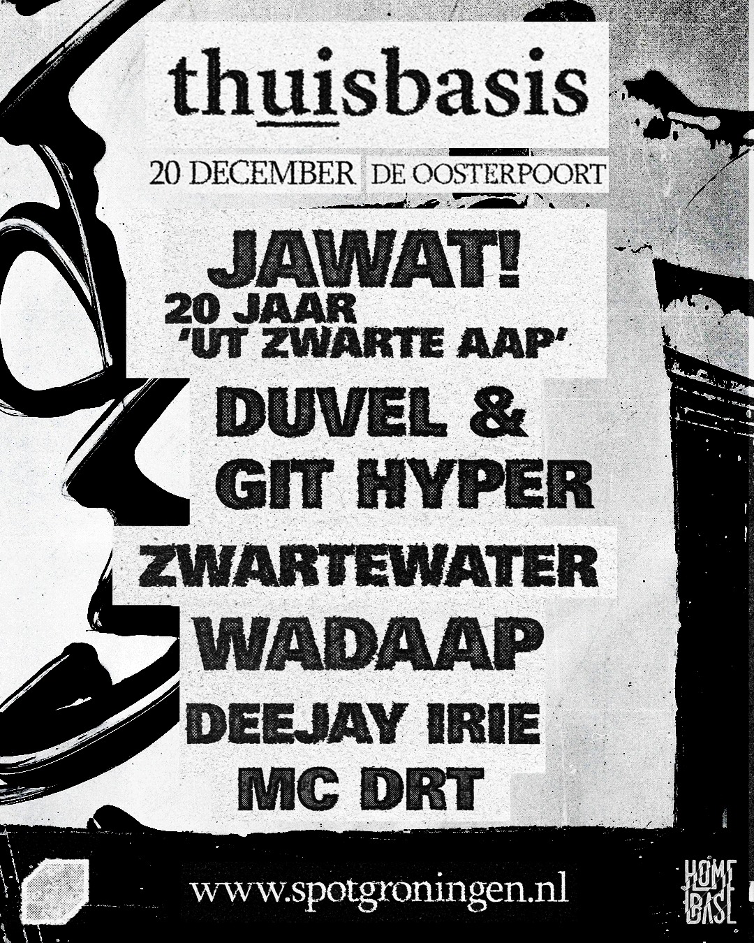 Zoals Bob Ross altijd zei: βhappy little accidentsβ. De originele datum werd verplaatst, één naam kwam te vervallen en toevallig had Jawat! net Hedon gesloopt met een jubileumshow voor βUt Zwarte Aapβ. Wij hebben via via contact gezocht en de show vrij snel rond kunnen maken. Duvel stond altijd al op onze lijst, en na de release van βDe Rode Draadβ met Git Hyper hebben wij onze kans gegrepen. ZWARTEWATER is gewoon dope en hadden Homebase al meermaals benaderd voor shows en nu voelde het als een logische stap hun toe te voegen aan deze line-up. Tenslotte konden de jongens van WadAap natuurlijk niet ontbreken: zij maakten indruk met hun nieuwste album en komen Groningen representen.