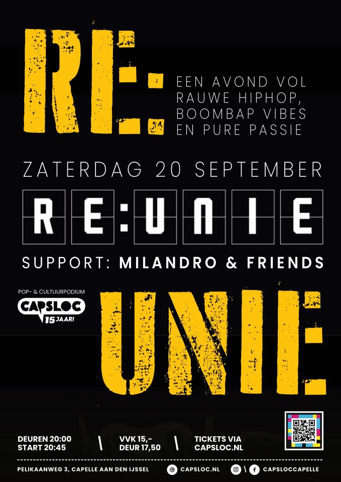 Op 20 september staat de formatie RE:UNIE in Capsloc in Capelle aan den IJssel. Om je hier alvast warm voor te krijgen hebben de mannen een “CAPSLOC CYPHER” gedropt. Zo komen Dinkey ValenTe, MiGA, Classy, Metalz, EST Madboogie en MarryMarv voorbij met een bijdrage, maar ook Milandro die de avond van een dope voorprogramma zal gaan voorzien. De productie komt uit handen van Classyboombap.