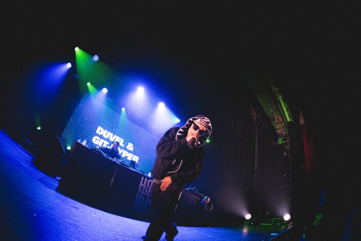 De set kende een heerlijke opbouw: van rustigere tracks tot keiharde bangers afkomstig van diverse DuvelDuvel-releases en materiaal van de albums “De Rode Draad” en “Bigi Poku”. Op laatstgenoemde album zijn ook bijdragen te horen van Nosa, bekend van formaties als Zo Moeilijk en RAFTING GOODS. Ook Nosa was deze avond aanwezig om mee te spitten en her en der de backing vocals van Duvel te verzorgen.